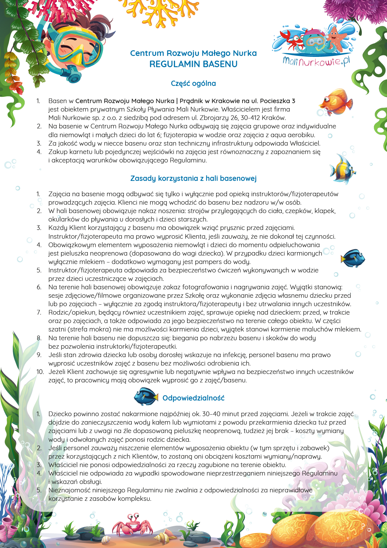 Szkoła prowadzi zajęcia dla dzieci od 3 miesiąca życia do wieku przedszkolnego. Podstawa przyjęcia na zajęcia to samodzielne trzymanie główki przez malucha, sprawny układ immunologiczny oraz wyrażenie zgody przez pediatrę na udział w zajęciach (nie wymagamy zaświadczenia, jednak zachęcamy do konsultacji z lekarzem). Nigdy nie jest za późno, aby przyjść na pierwsze zajęcia, jednak im szybciej maluszek zacznie uczestniczyć w kursie, tym łatwiej przyswoi ćwiczone umiejętności. Zachęcamy zacząć oswajać swoją pociechę z wodą już od pierwszych kąpieli.